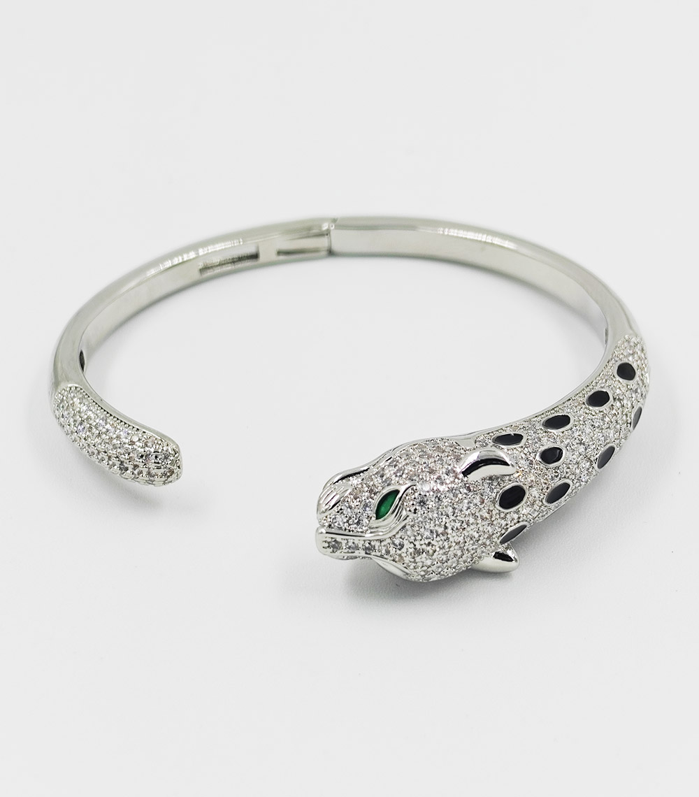 Unleash your inner strength with our Fierce Jaguar Bangle a perfect blend of bold elegance and everyday luxury. Crafted from premium stainless steel and finished with a high shine silver polish, this piece radiates power and grace. The jaguar design, accented with black enamel spots and crystal studded detailing, captures confidence and sophistication in every glance.