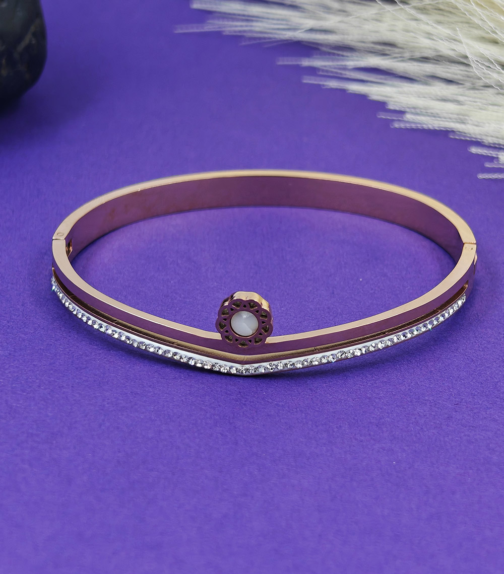 This elegant gold plated stainless steel bangle is a perfect blend of sophistication and everyday style. Designed with a sleek, polished finish, it features delicate ring accents embellished with sparkling cubic zirconia stones that add a subtle touch of glamour.