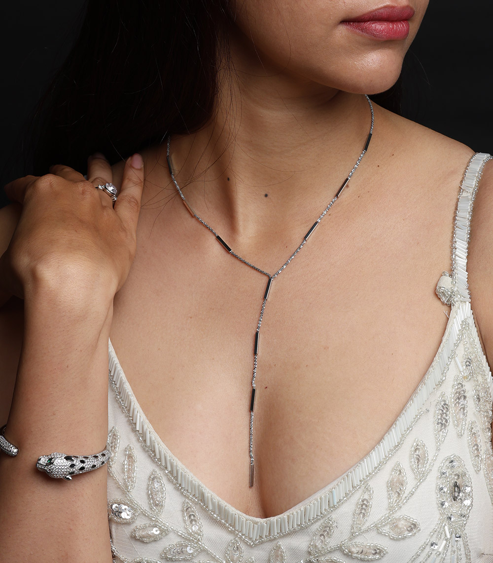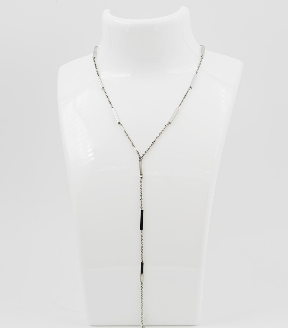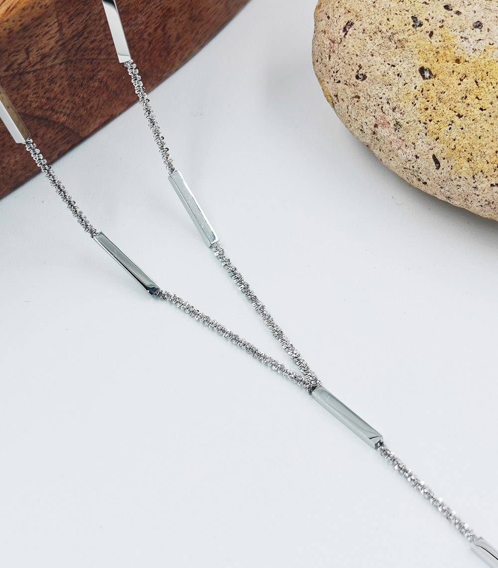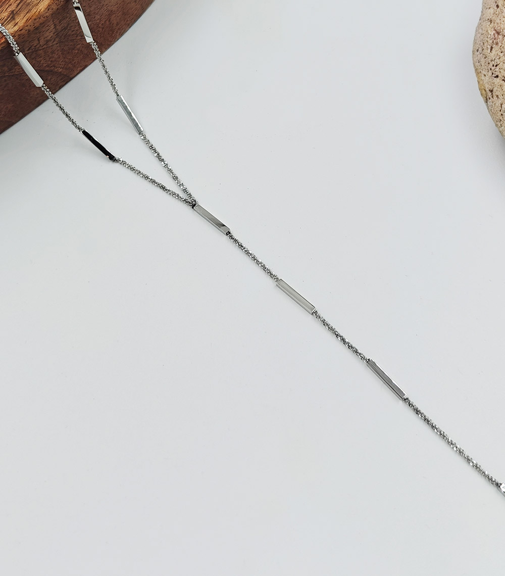 – Material: High quality stainless steel – Finish: Polished silver tone – Design: Minimalist lariat style with bar detailing – Waterproof and tarnish resistant – Hypoallergenic and skin friendly – Lightweight and comfortable for daily wear – Durable chain with secure clasp