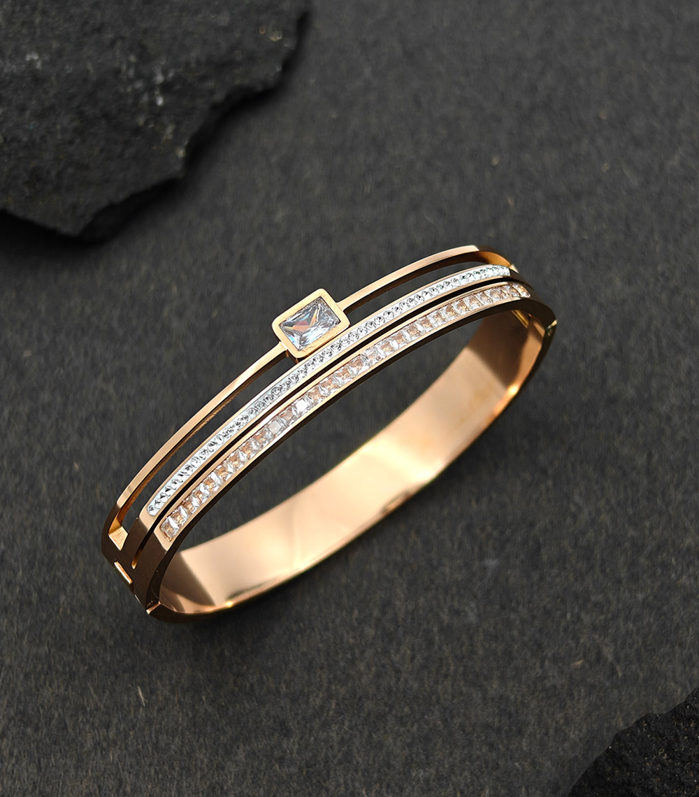 This exquisite gold plated stainless steel bangle is the perfect blend of elegance and durability. Designed for everyday wear, it features a sleek, polished finish with a stunning square cut centerpiece stone that adds a refined sparkle. The dual layered band is embellished with delicate cubic zirconia accents, creating a sophisticated and timeless look.