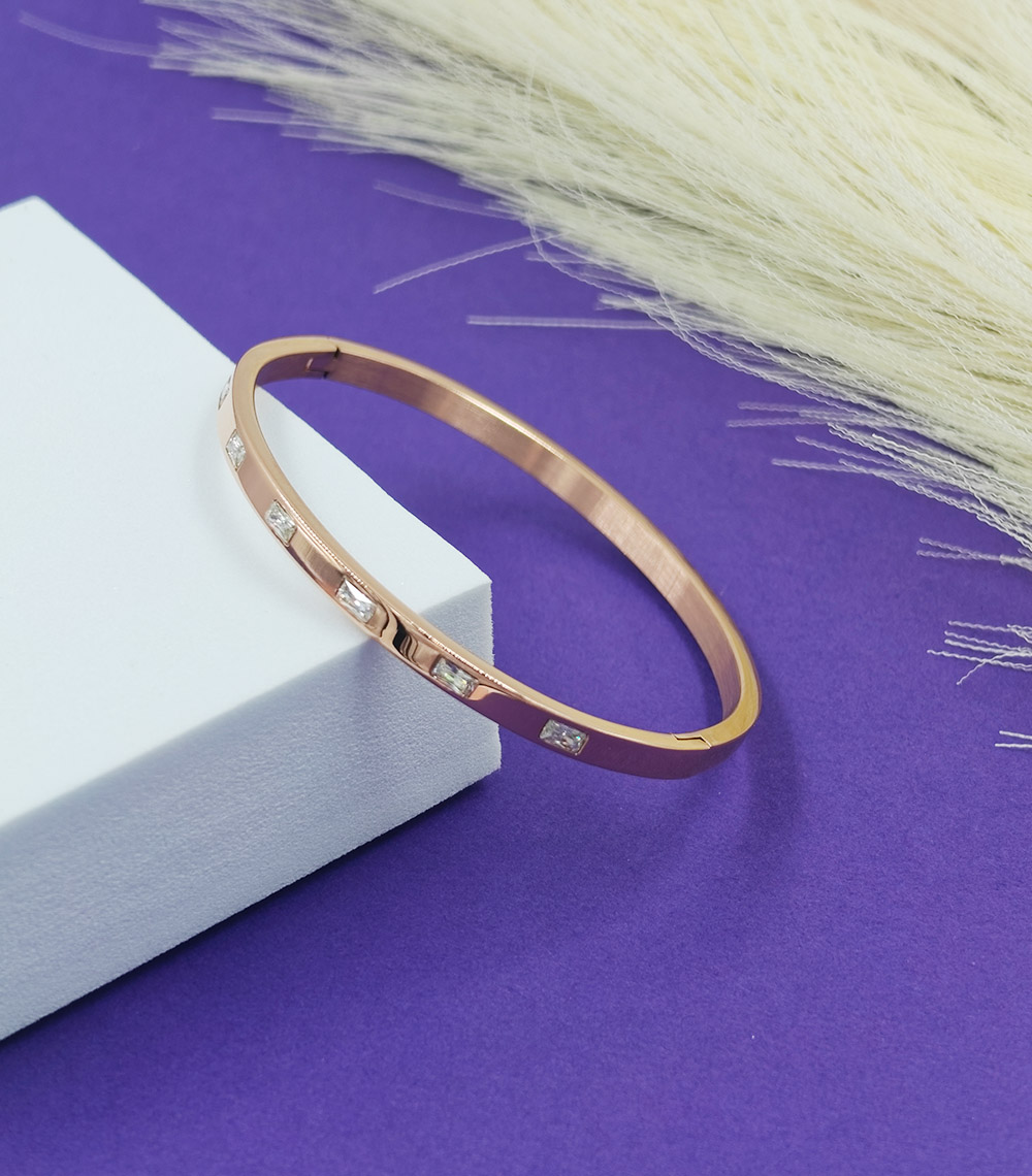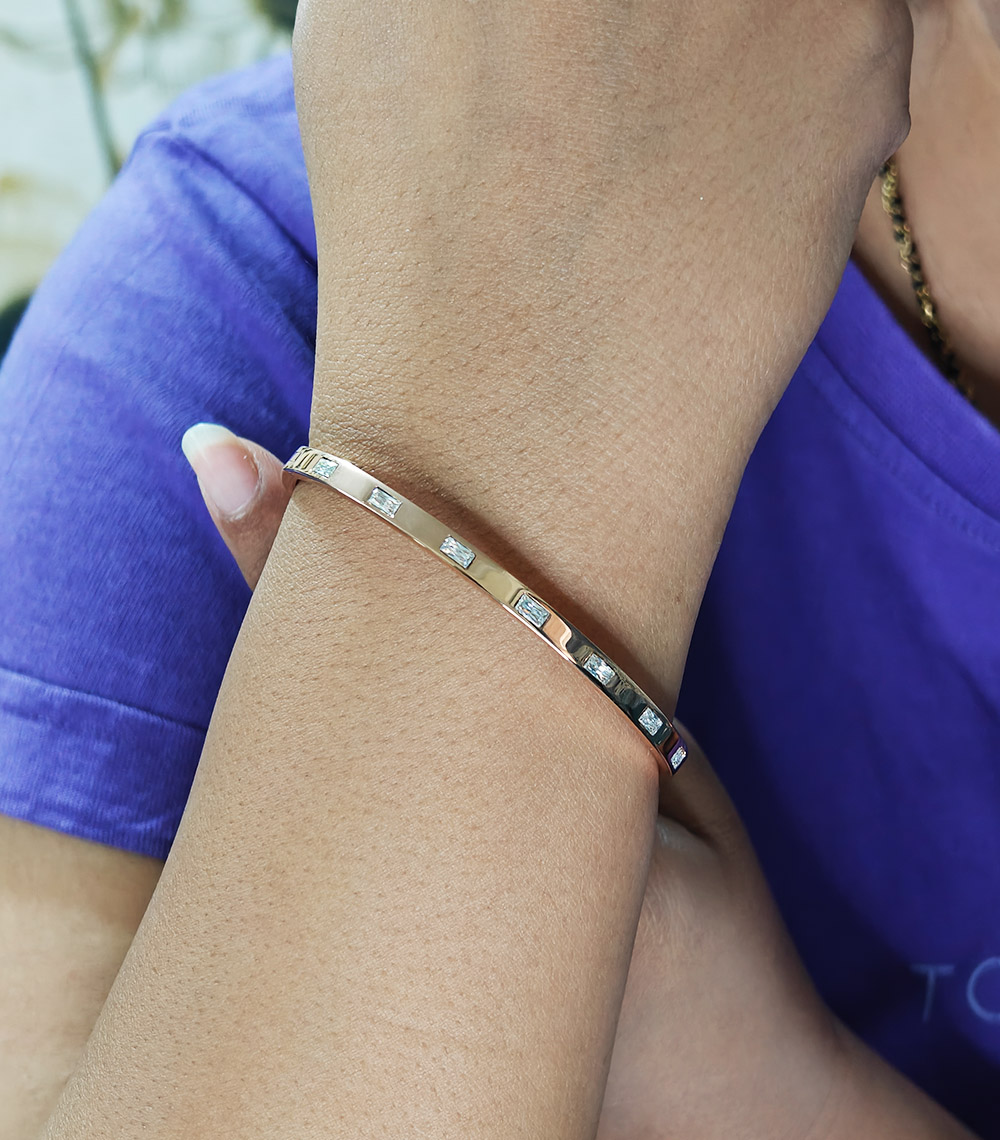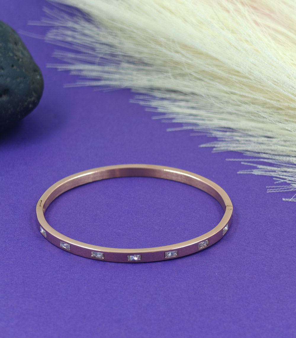 This sleek and modern bangle is crafted from high quality stainless steel and finished with a premium gold plating for a luxurious touch. Designed for everyday wear, it features a minimalist band adorned with sparkling cubic zirconia stones that add just the right amount of shine.