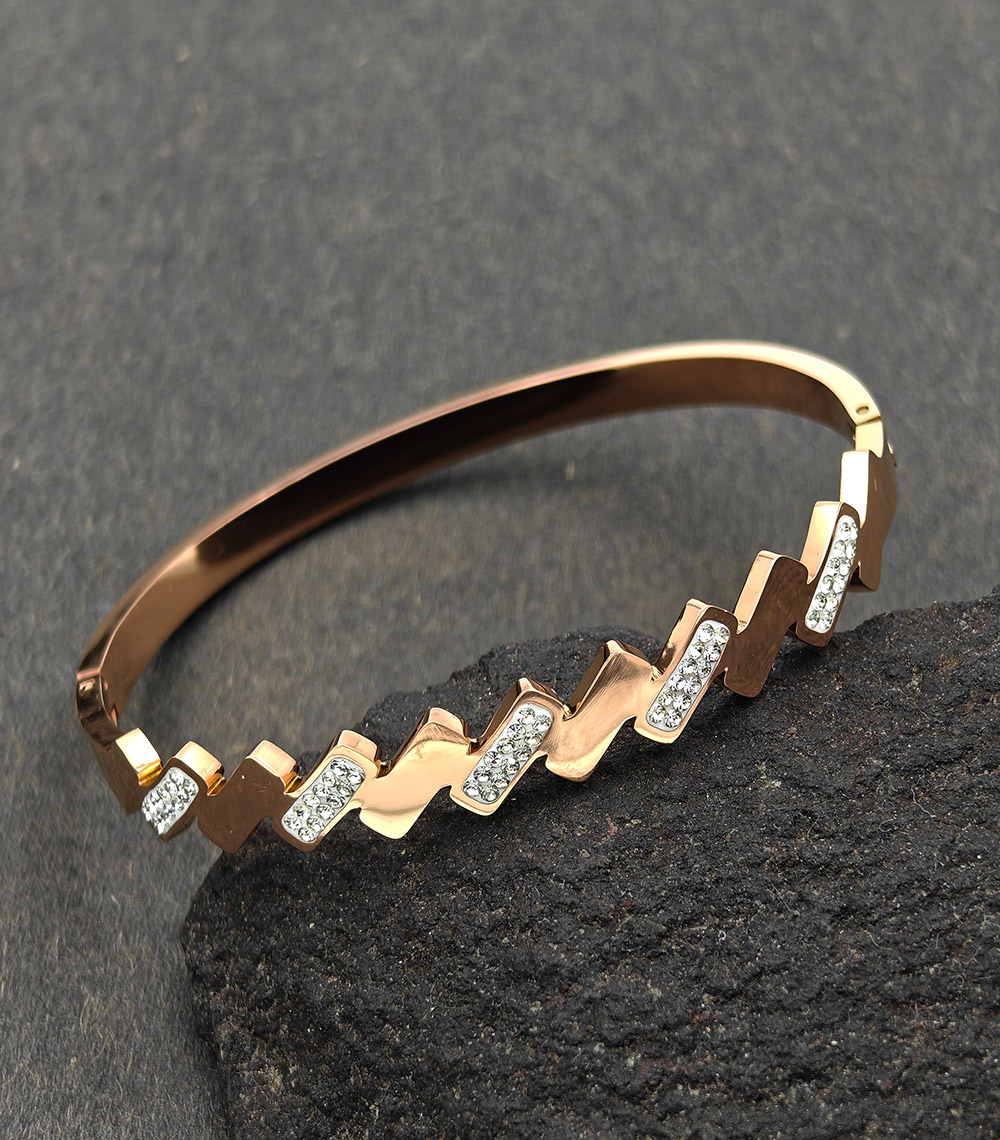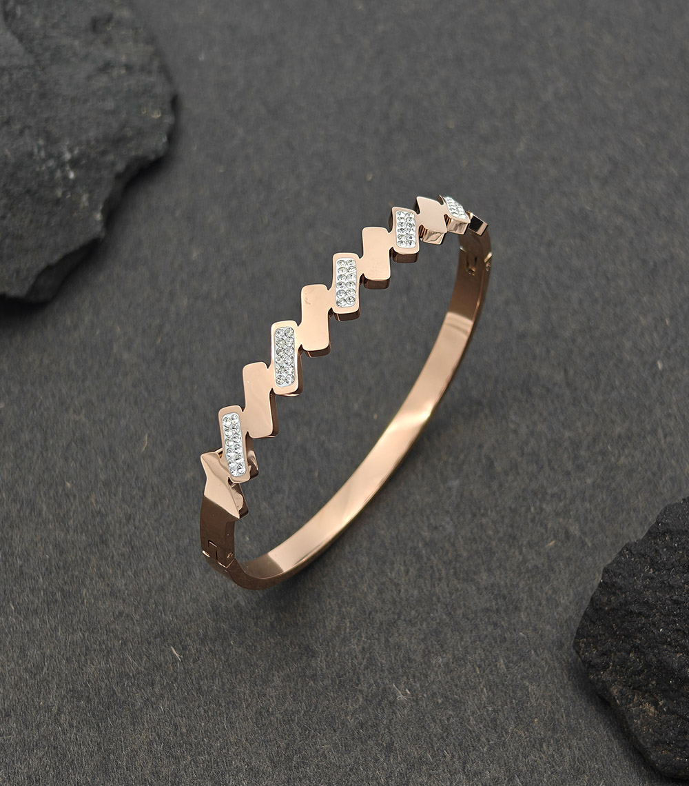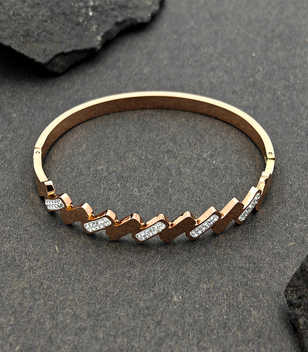 This elegant gold plated bracelet is a perfect blend of modern design and timeless sophistication. Crafted from premium stainless steel, it features a unique zigzag pattern adorned with sparkling cubic zirconia stones that add a subtle touch of glamour. The sleek gold finish enhances its luxurious appeal, making it an ideal accessory for both everyday wear and special occasions.